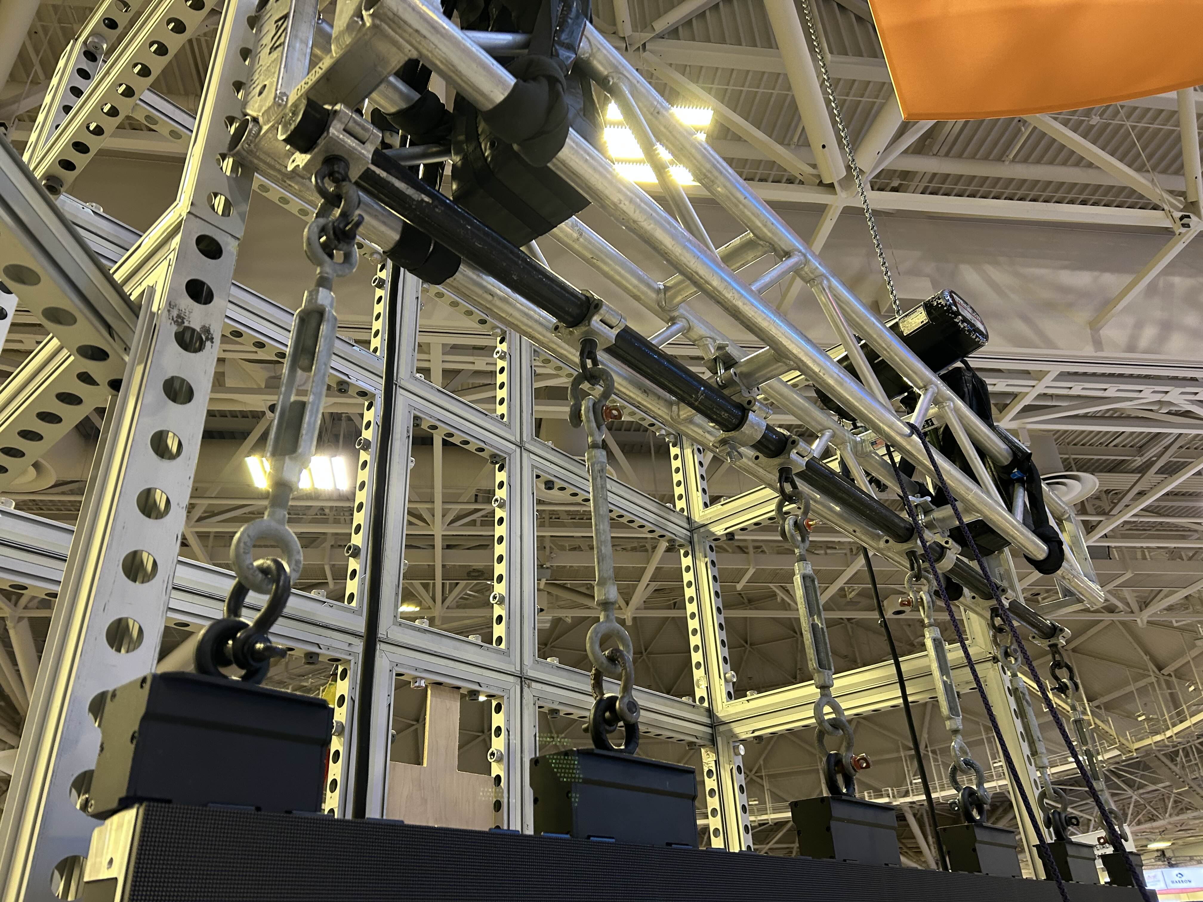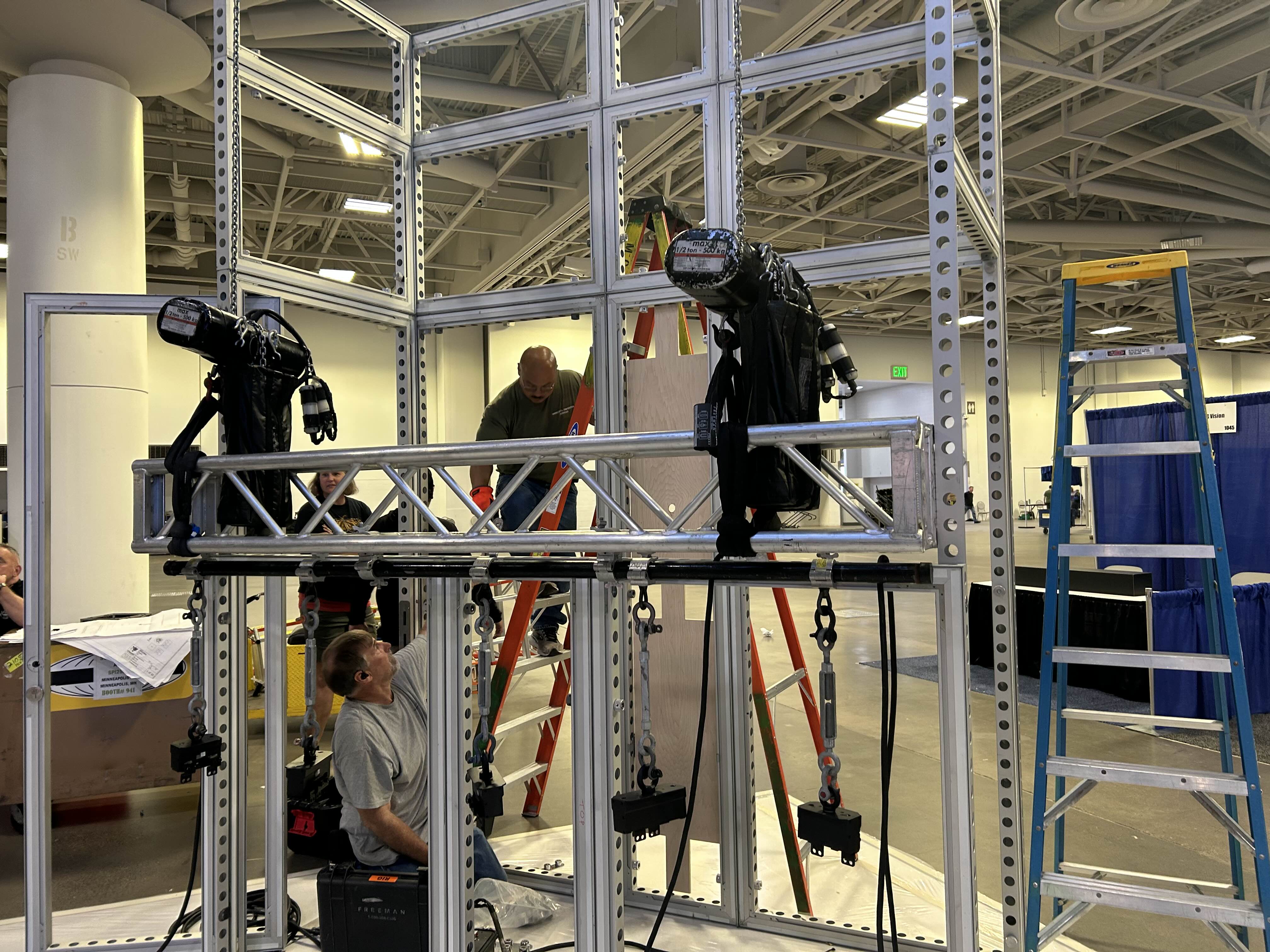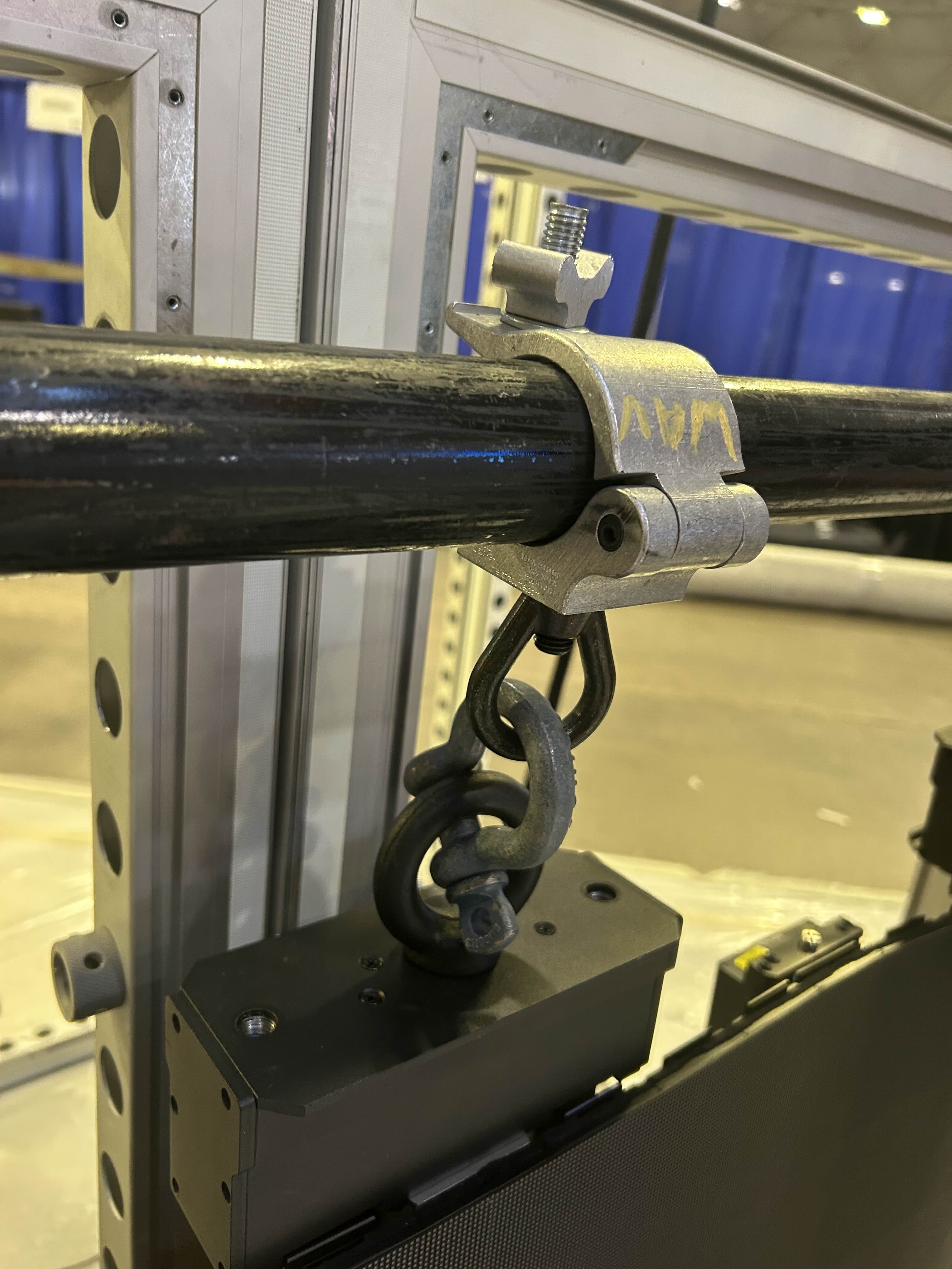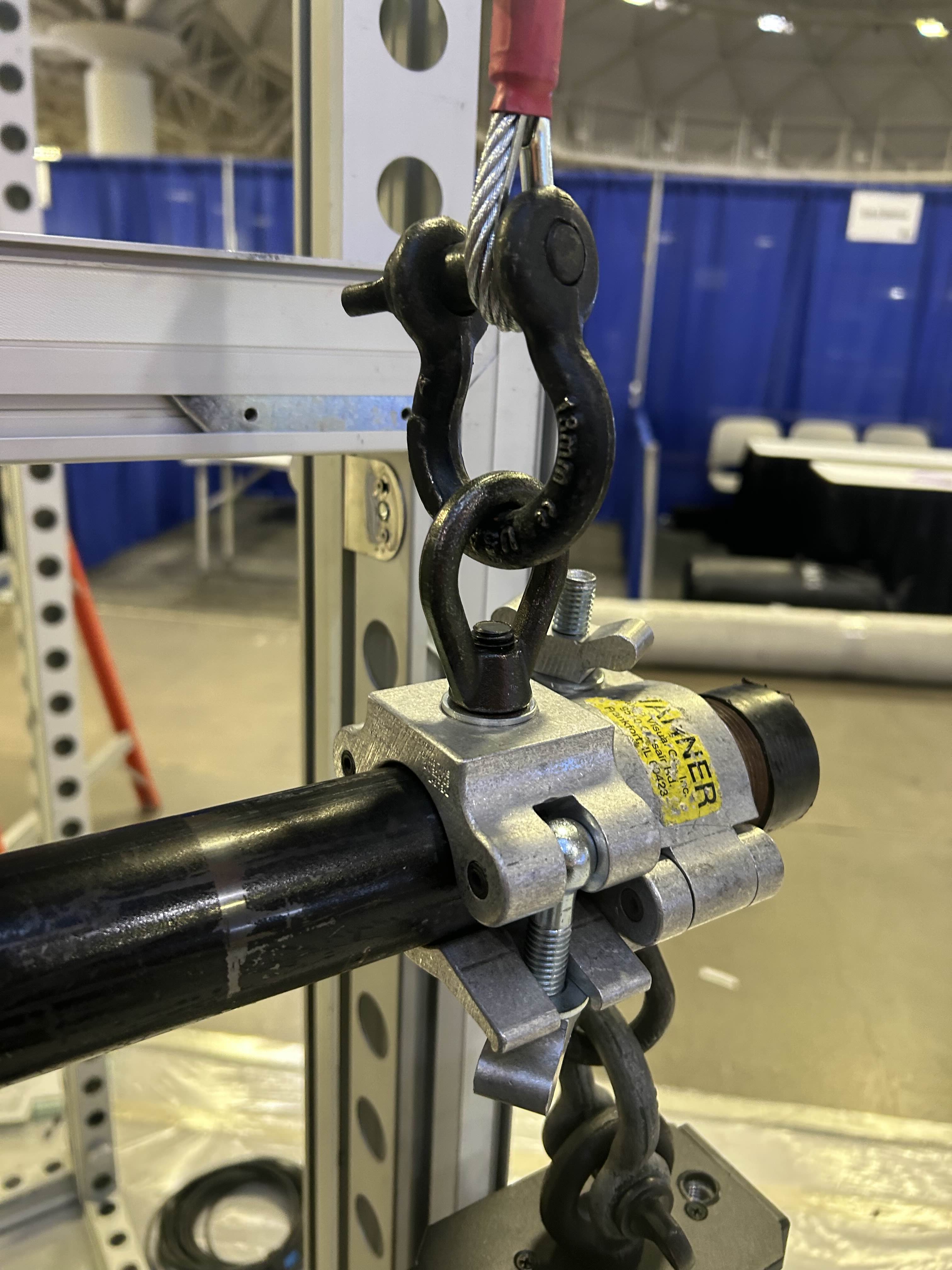 Sometimes we use air craft cable to hang the pipe lower than the truss. This can get the truss up out of the way in case it blocks logos